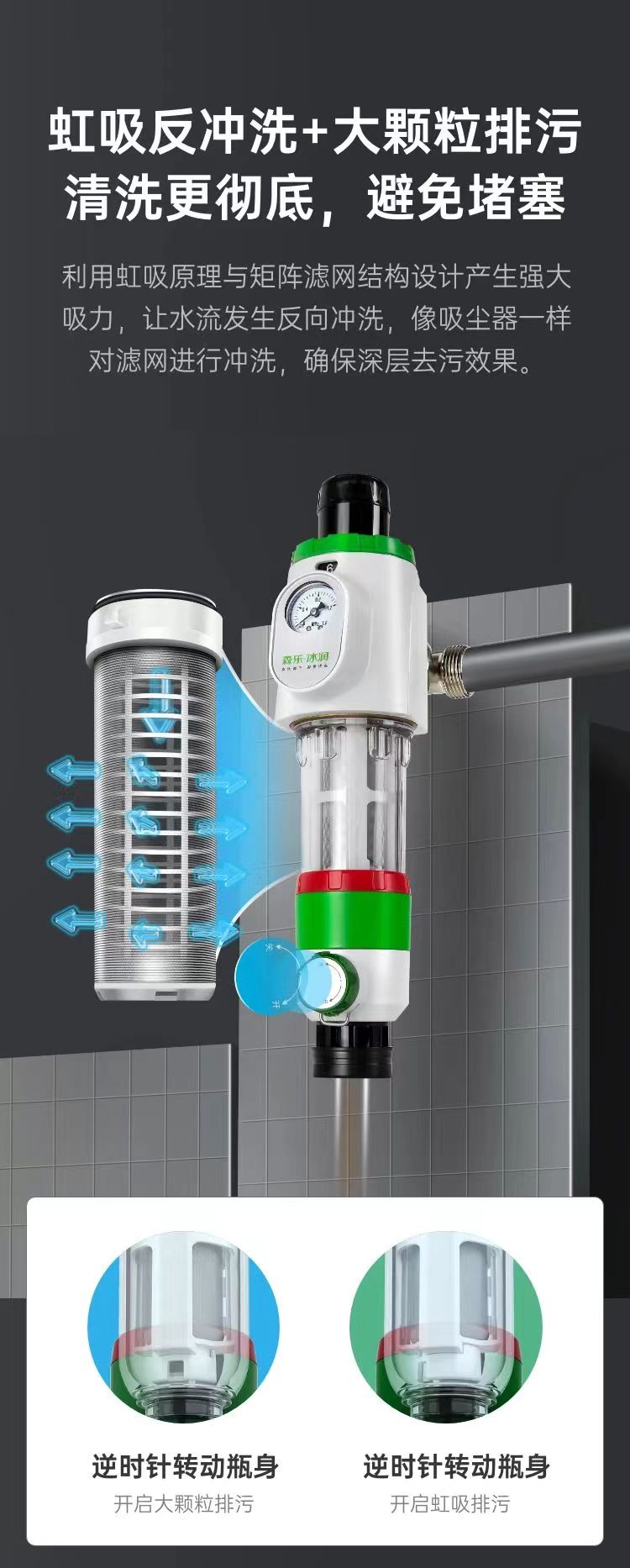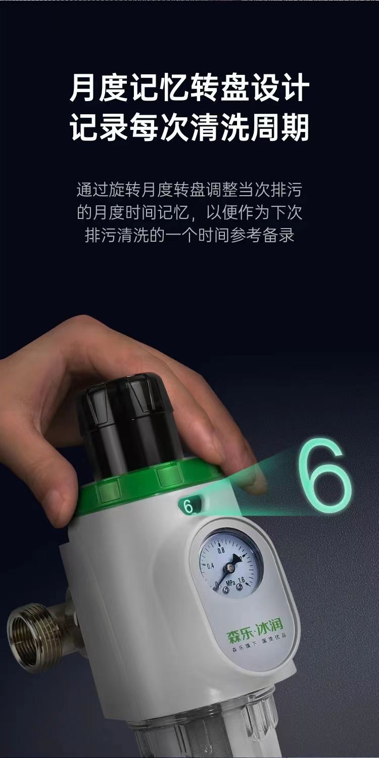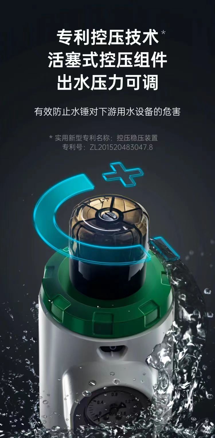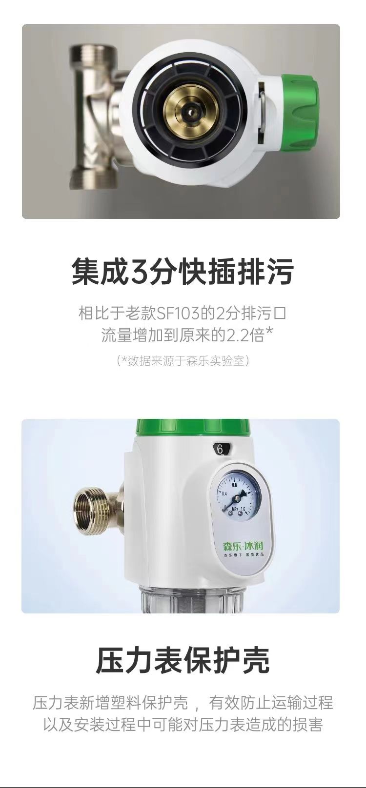 森乐·冰润SF103管道保护器配有活塞式控压组件,同时采用“环绕虹吸+双面刷洗+净水反冲”三合一技术,高效去除水中颗粒污染物,同时还可以有效消除水锤,稳控水压。