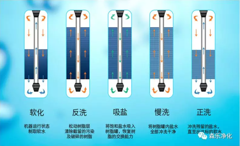 逆流再生的工作流程是:软化——注水——吸盐——反洗——快洗——软化