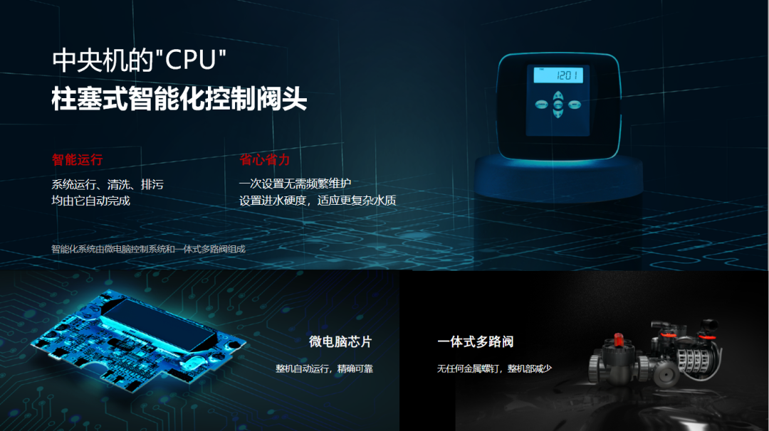 智能化系统由微电脑控制系统和一体式多路阀组成,通过光学电子控制,实时精准控制设备运行,正反冲洗、逆流再生。