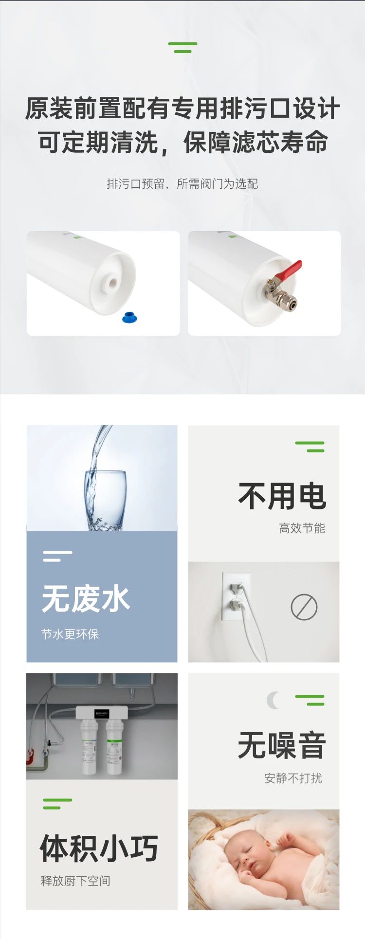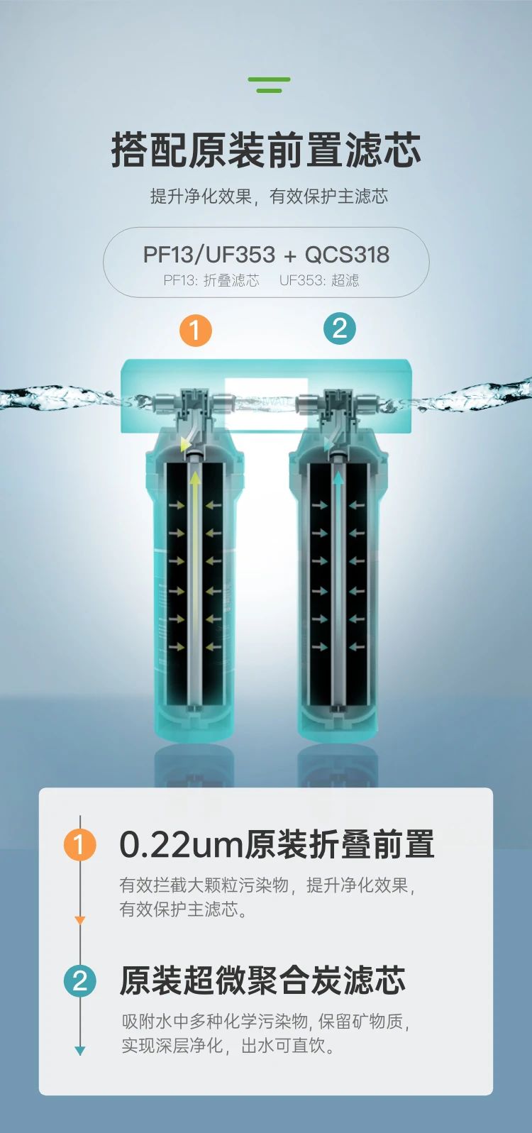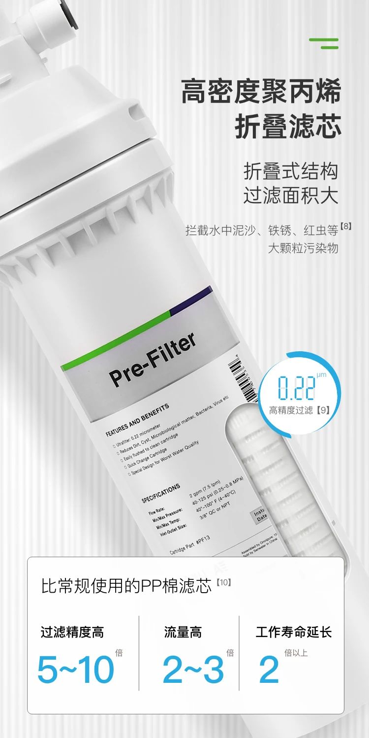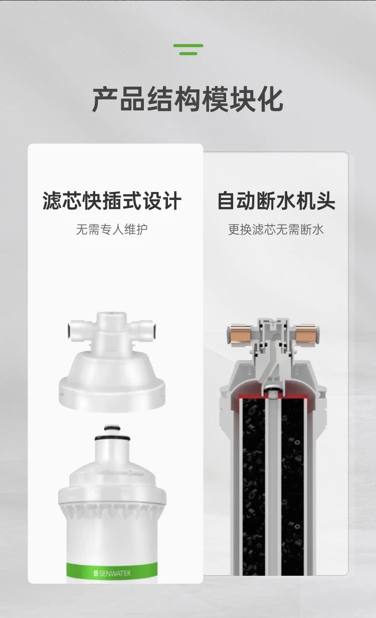 QCS508整机原装进口,配用原装前置过滤器、自动断水机头,配合一体式挂板,更简洁更放心。滤芯结构升级,在保障净水流量的同时解决漏炭隐患。