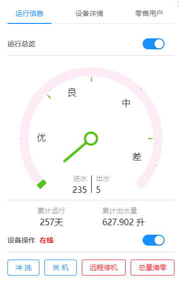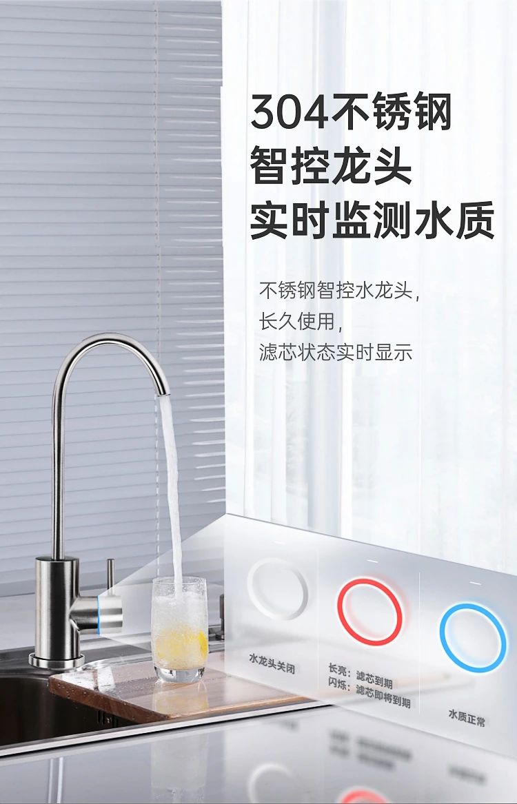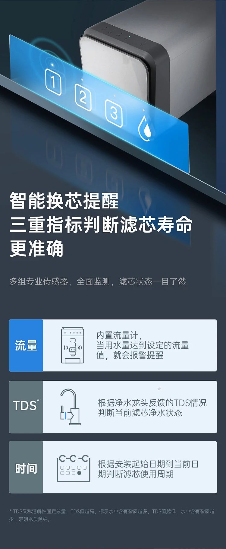 根据出水情况实时监测水质安全,在指示灯显示为蓝色时表示出水正常,指示灯显示变为红色或红色闪动时则表明滤芯寿命到期或即将到期,提醒你及时更换滤芯,保证正常使用。