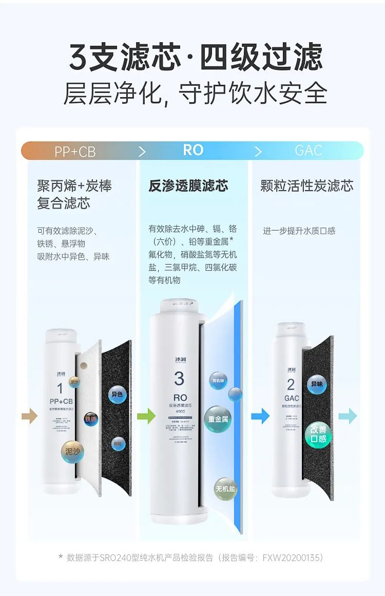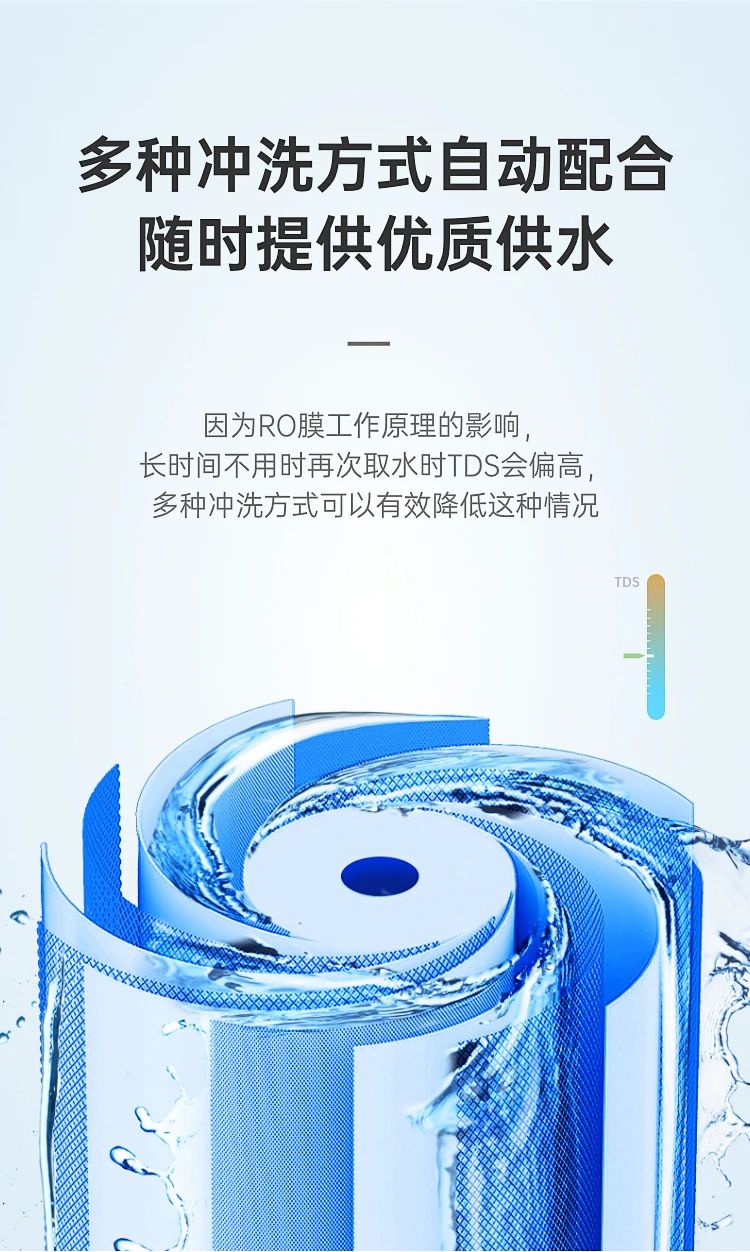 SRO255纯水机设计有专用程序,使用三重冲洗方式结合,减少膜表面污物沉积,防止细菌滋生和二次污染,进一步提升净化效果,延长滤芯的使用寿命。