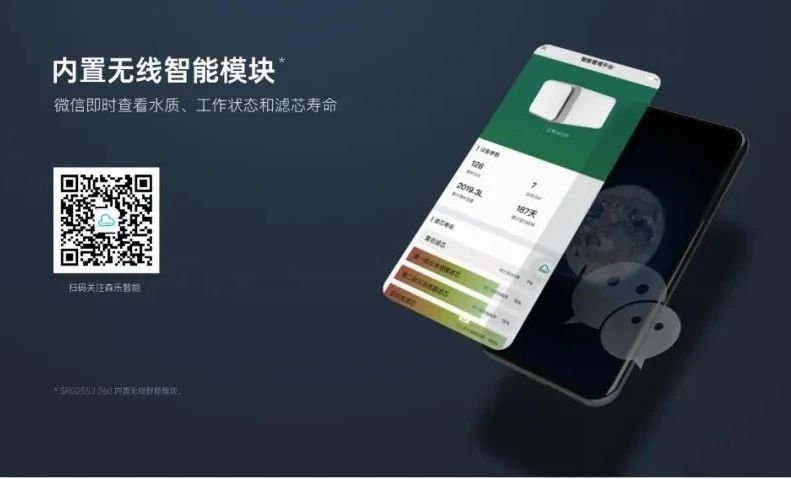 新款SRO255纯水机配用专门设计的电路板,对接森乐自主开发的S+智能平台,轻松在手机或电脑上远程检查工作状态并进行管理,微信上自动提示出水质量和滤芯寿命,启停机器或是远程冲洗。