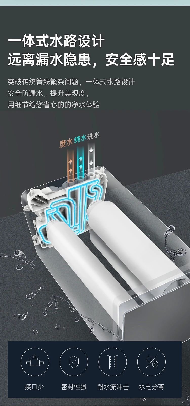 一体式成型,体积小、接头少,更稳定,降低漏水风险。